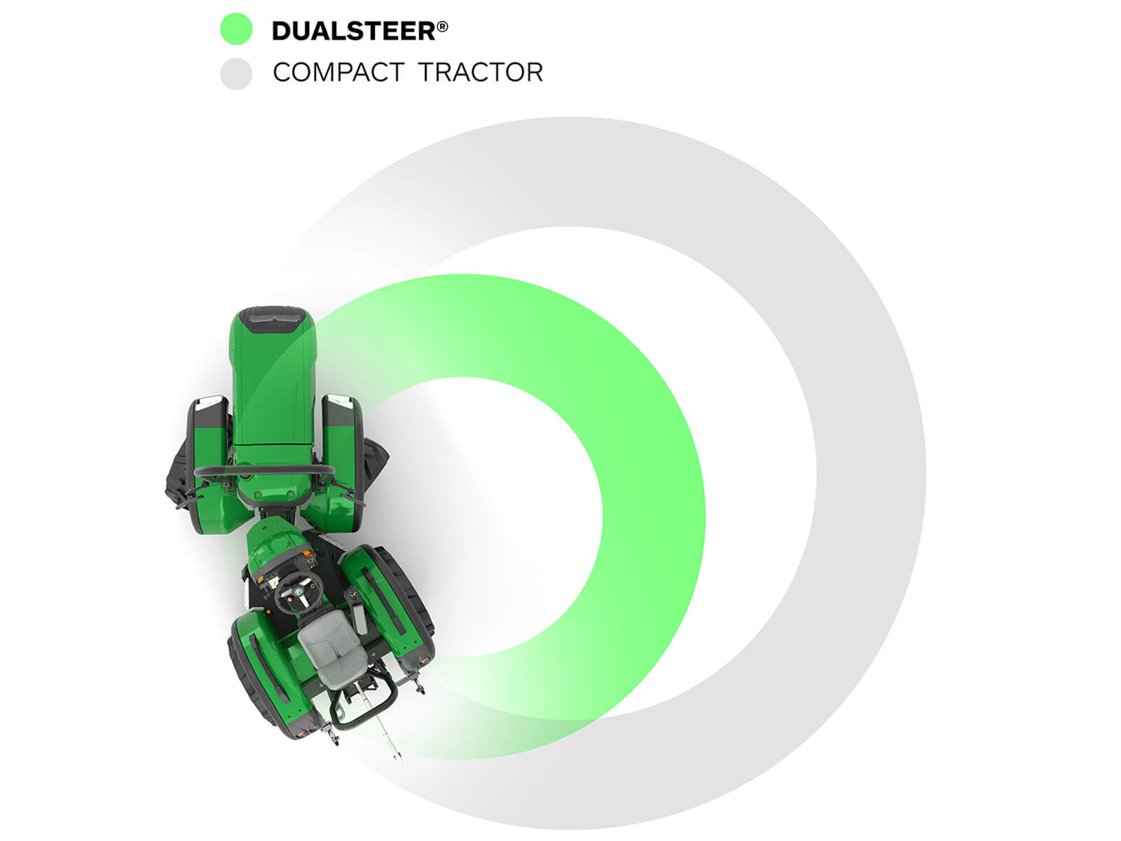 Dualsteer®, eklemli traktörlerin manevra kabiliyetini, direksiyonlu modellerin sunduğu güvenlik ve stabilite ile bir araya getirir.