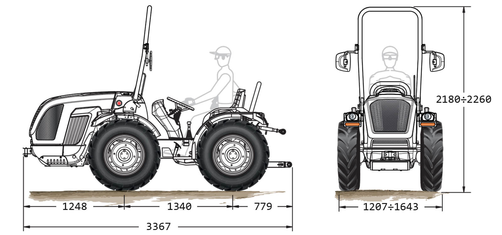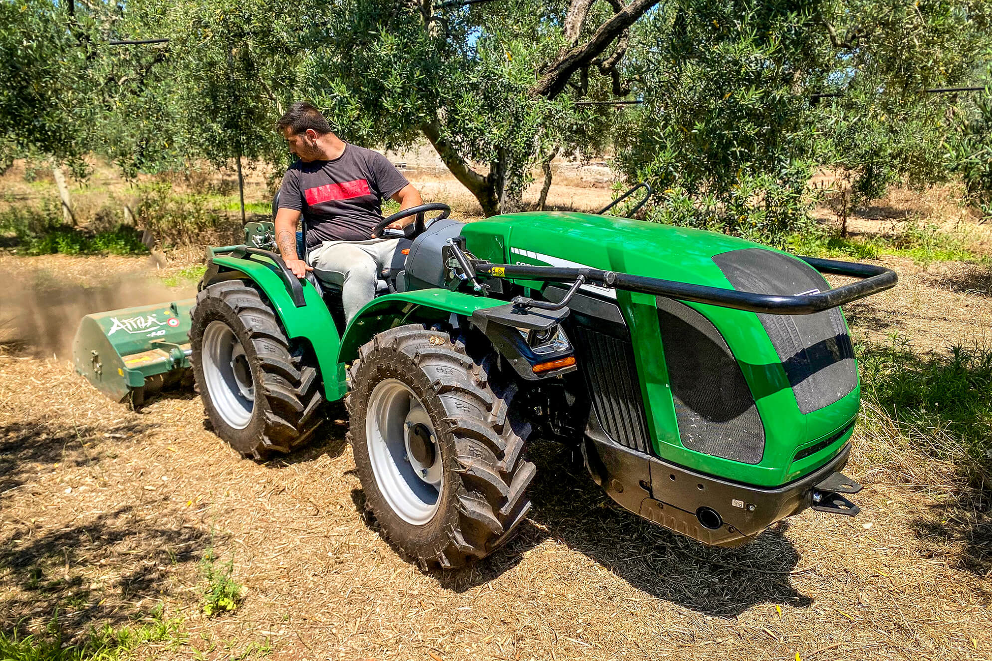 49 hp (Aşama V) isodiametrik traktör. Kompakt boyutlar, stabilite ve eğimli alanlarda kullanım için uygun yapışma kabiliyeti.