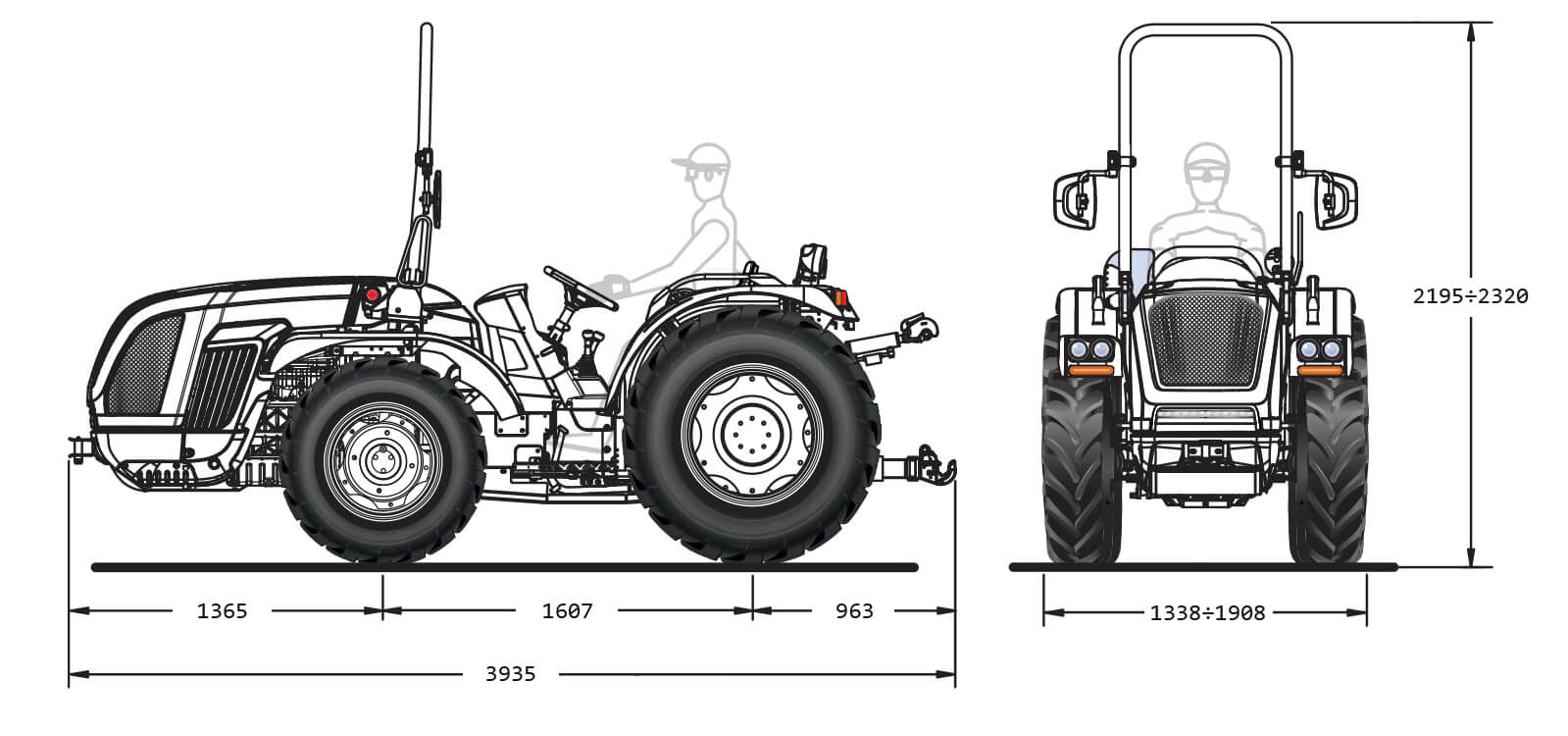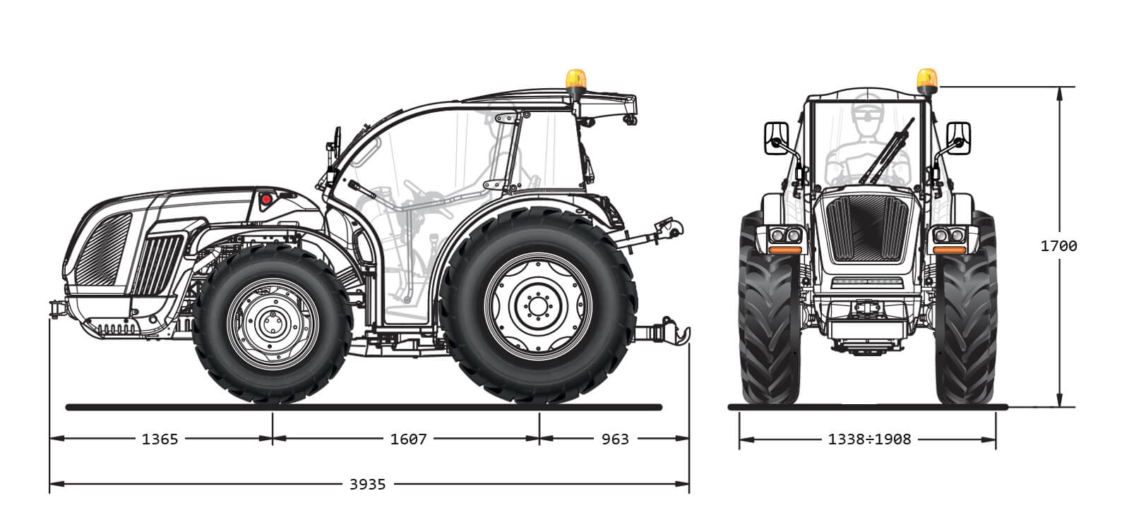 Yerden yüksekliği yalnızca 170 cm olan alçak şasi, kategorisindeki en düşük sürüş pozisyonunu sunar. Bu özellik, pergola bağları, gölgelik bitkiler ve seralar gibi alanlarda çalışmayı son derece kolay hale getirir.